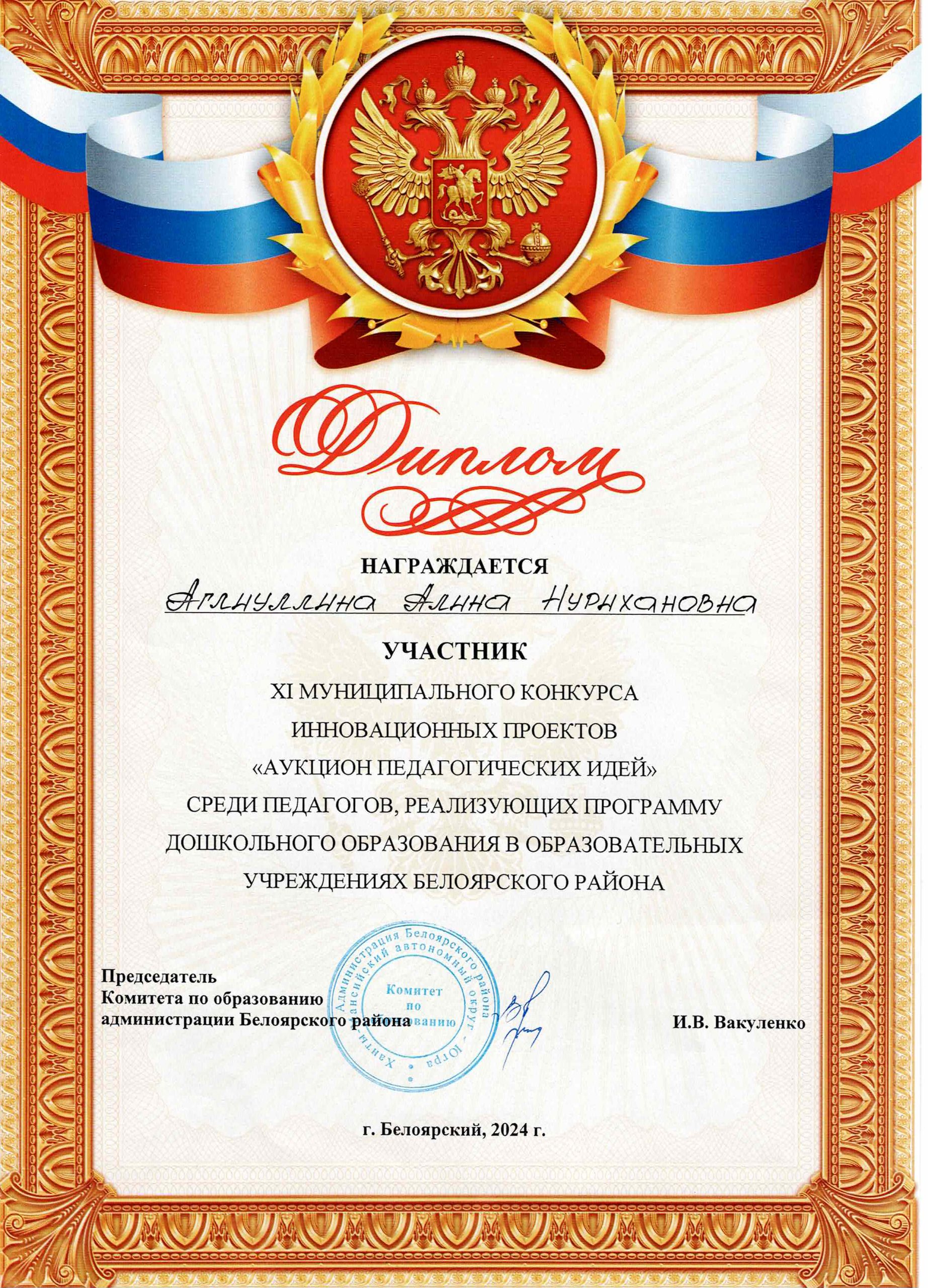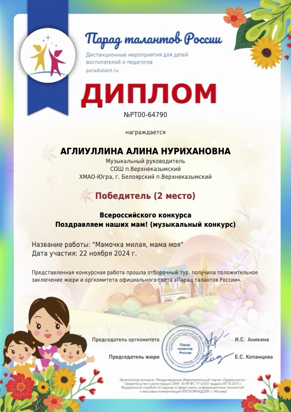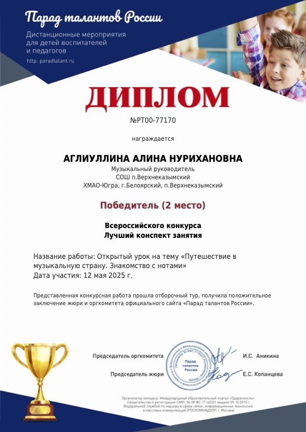 Вас приветствует музыкальный руководитель Муниципального автономного общеобразовательного учреждения Белоярского района «Средняя общеобразовательная школа п. Верхнеказымский» — Аглиуллина Алина Нурихановна. Работаю музыкальным руководителем в детском саду с 2024 года, имею первую квалификационную категорию.